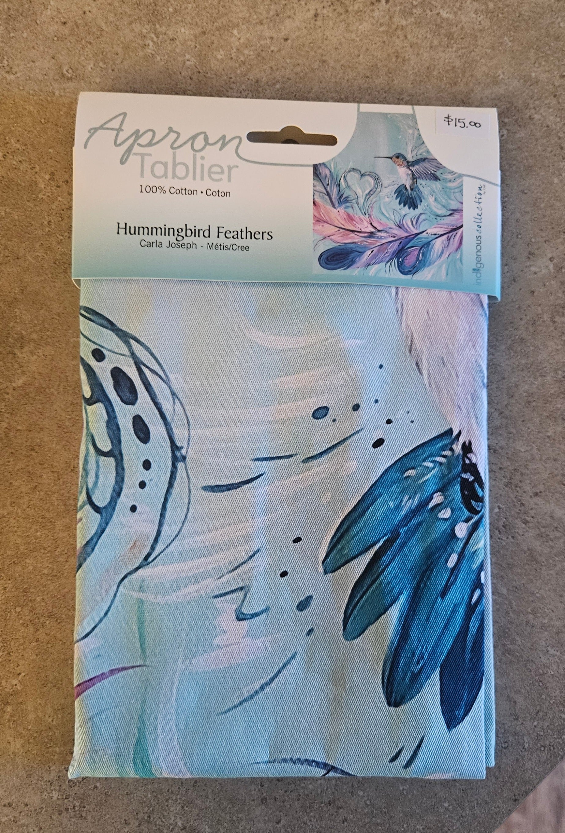 A beautiful and unique apron featuring Hummingbird Feathers by Indigenous Artist Carla Joseph