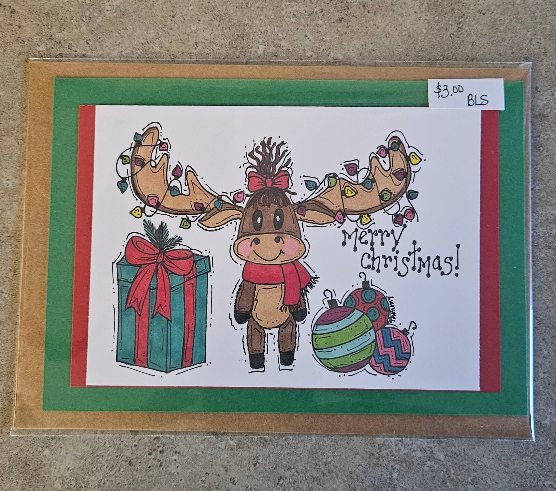 An adorable little Christmas Card featuring a moose tangled with lights but ready for Christmas!
