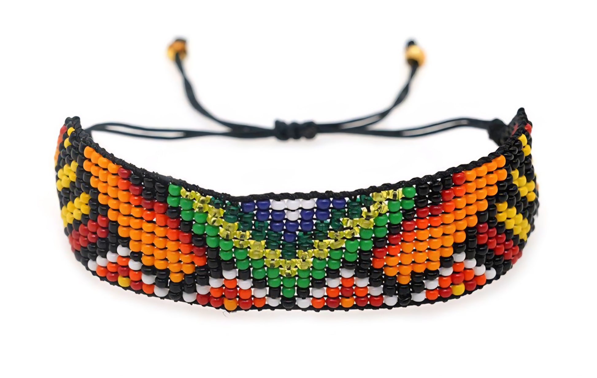 Beautiful handmade beaded flat bracelet with orange, green, yellow, black, blue, white and red beads.