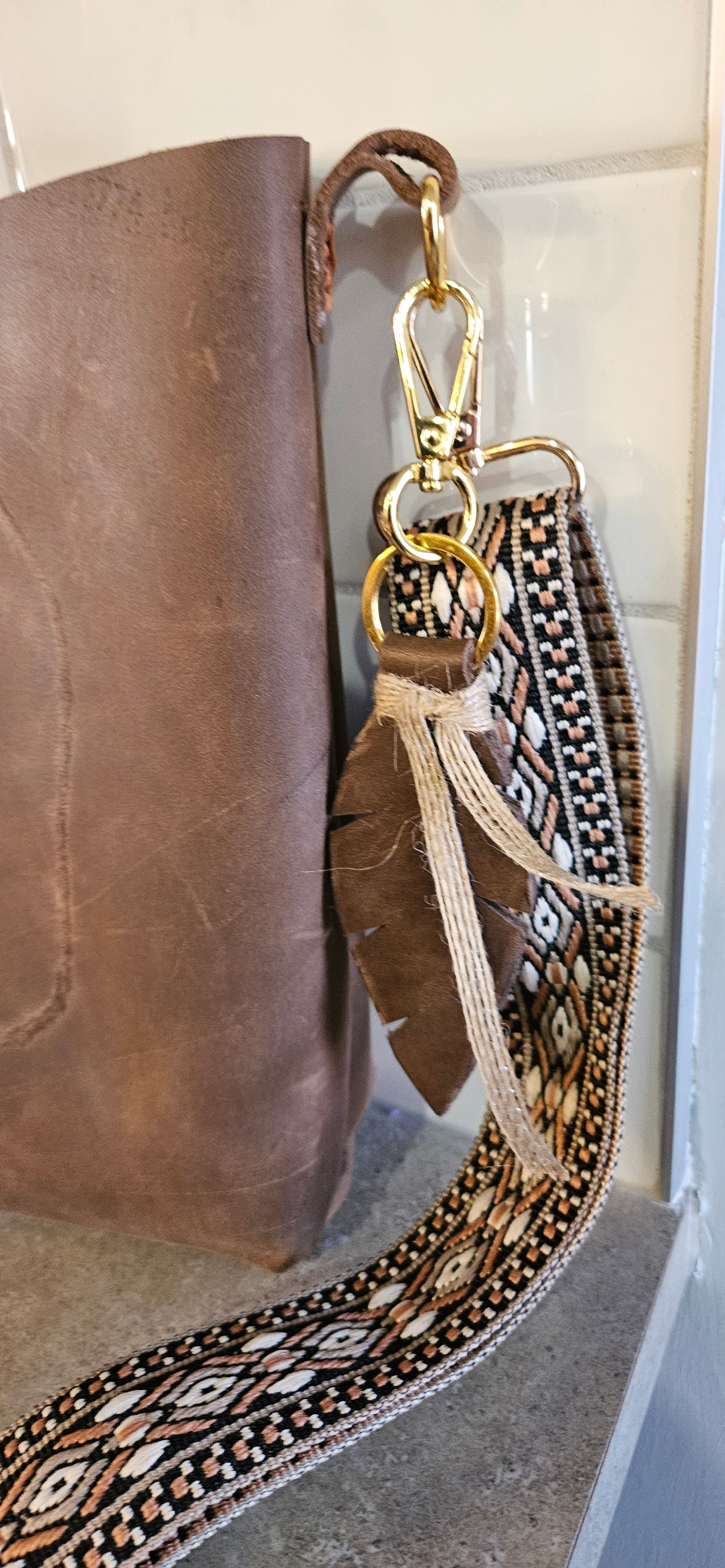 Includes a beautiful black, cream and brick colored detachable strap as well as a leather feather keychain which is also detachable