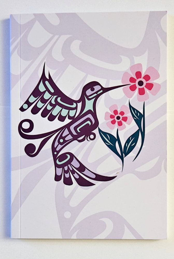 Beautiful pinks and purples, this little "Hummingbird" notebook will fit almost anywhere. Original art by Indigenous Artist Francis Dick.