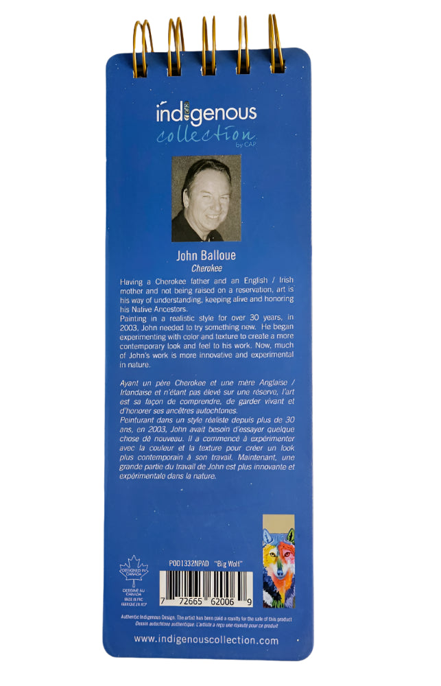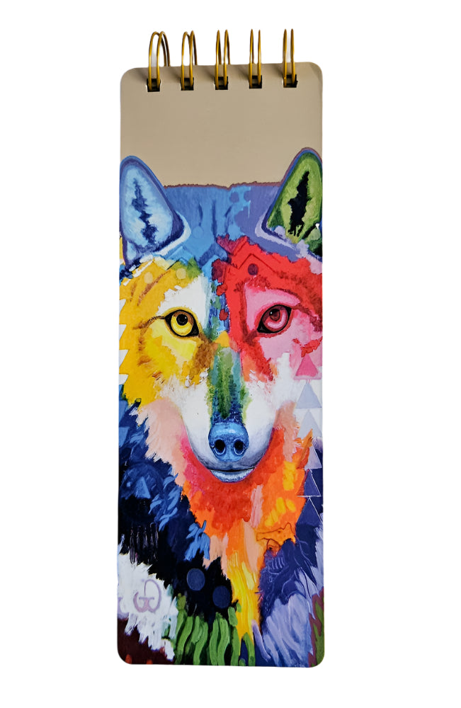 A beautiful realistic painting of a colorful Big Wolf by Cherokee Artist John Balloue in a handy notepad.