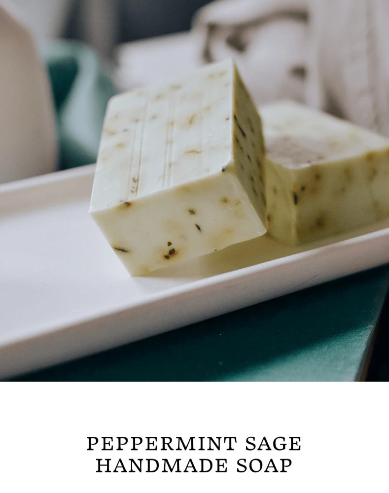 Peppermint Sage Soap is handmade with a base of coconut, olive and sustainable palm oil. Infused with wild mint, along with sage, and peppermint essential oils, it invigorates the senses.